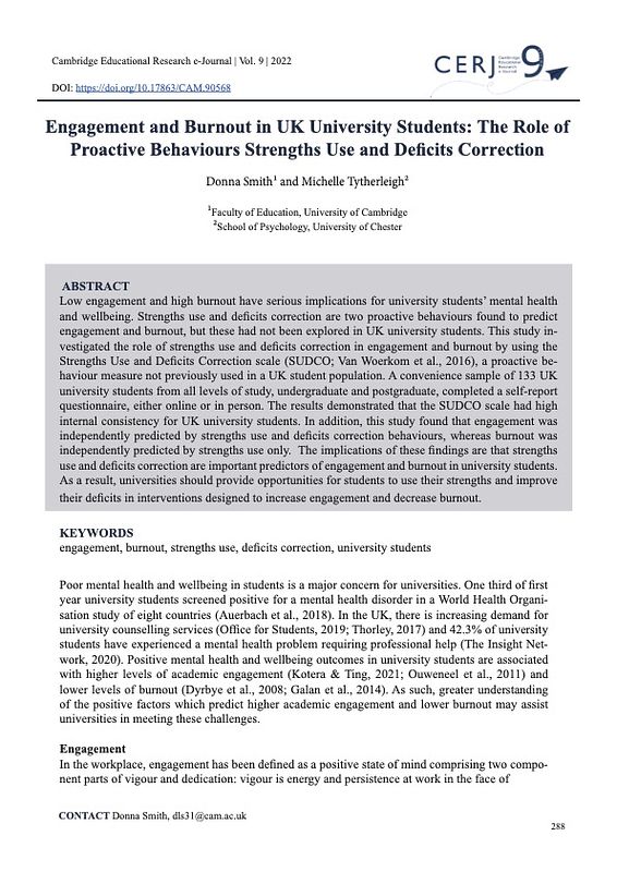 Smith, D., & Tytherleigh, M. (2022). Engagement and Burnout in UK University Students: The Role of Proactive Behaviours Strengths Use and Deficits Correction. Cambridge Educational Research e-Journal, 9, 287–298. https://doi.org/10.17863/CAM.90568