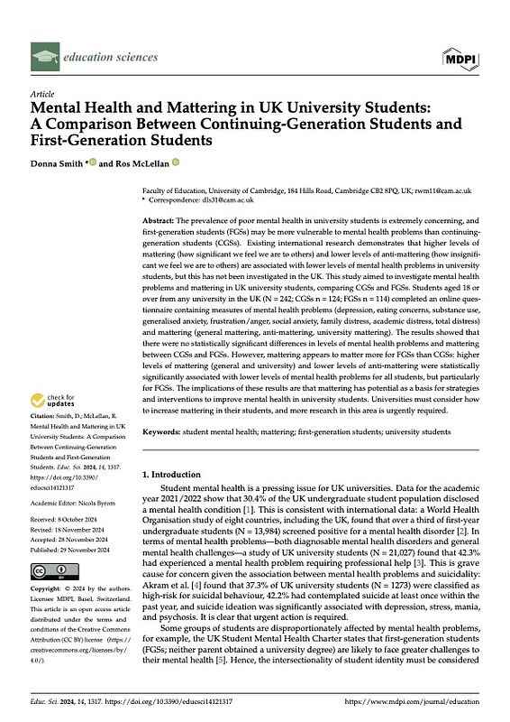 Smith, Donna, and Ros McLellan. “Mental Health and Mattering in UK University Students: A Comparison Between Continuing-Generation Students and First-Generation Students.” Education Sciences 14, no. 12 (2024): 1317.