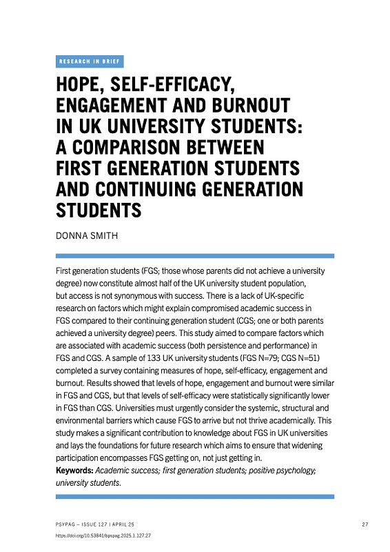 Smith, D. (2025). Hope, Self-Efficacy, Engagement and Burnout in UK University Students: A Comparison Between First Generation Students and Continuing Generation Students. PsyPAG Quarterly, 1(127), 27–32. https://doi.org/10.53841/bpspag.2025.1.127.27